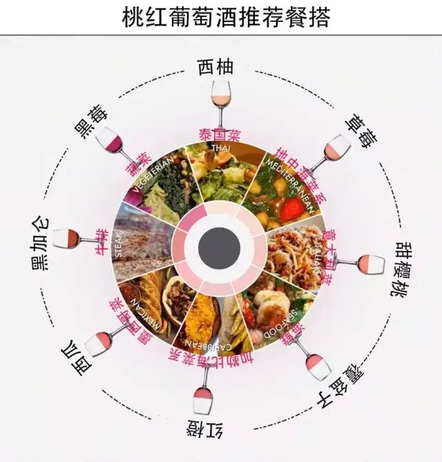 桃红葡萄酒是“配餐小能手”,几乎能与所有的菜肴搭配。为方便各位对桃红葡萄酒和各种菜肴进行搭配,下图是各种桃红葡萄酒推荐搭配的菜肴。