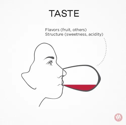 尝:通过舌头和口腔感知葡萄酒的味道结构(酸、甜、苦、咸)和风味(例如鼻后呼吸);