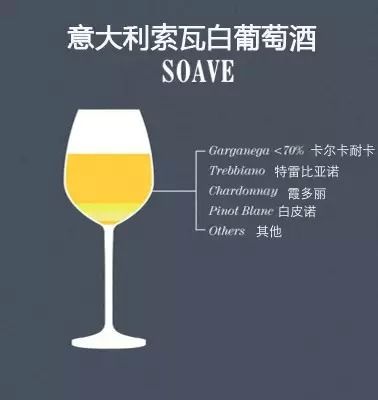 索瓦(Soave)白葡萄酒是意大利白葡萄酒的代名词,号称意大利白葡萄酒“三剑客”之一,主要由卡尔卡耐尔葡萄(Garganega)酿制而成,比例至少要达到 70%,其他葡萄品种如霞多丽和特雷比亚诺和白皮诺的总体含量则不得超过 30%。酒体中等,带着柠檬、杏仁的香气,橡木桶陈酿后还会有奶油的香味。