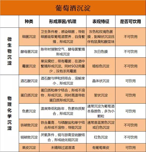 葡萄酒沉淀的因素有很多,按照机理可分为:微生物因素和物理化学因素。