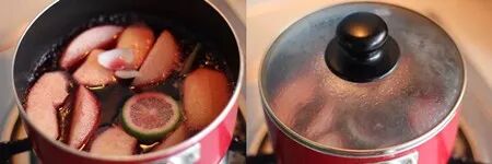 3.用中火炖煮15分钟后关火,等苹果在红酒中浸泡2个小时后即可食用。