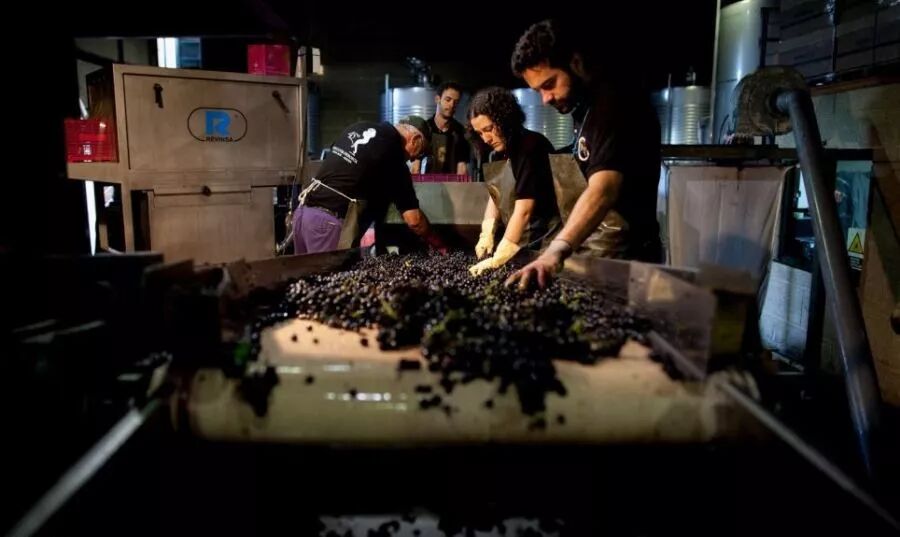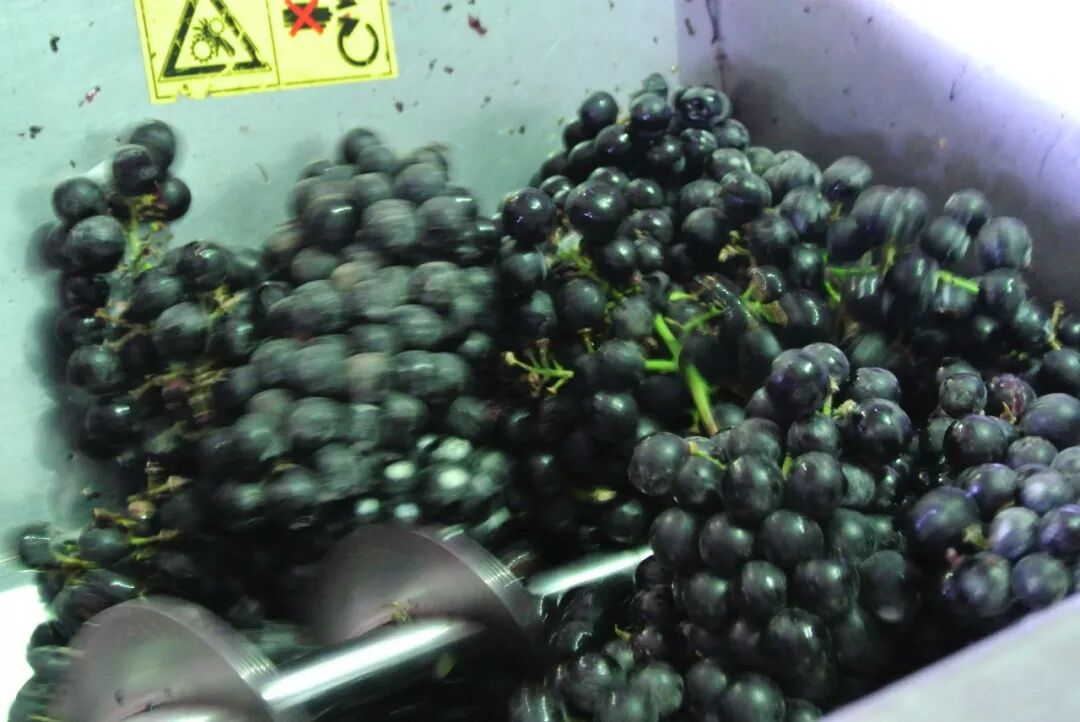 13. 经过筛选后的葡萄会进入除梗机中进行去梗。大部分酒庄现在使用的是去梗和破碎一体化的机器,所以在去梗的同时,葡萄果实可能会被轻微压榨或者完全压榨(白葡萄品种)。