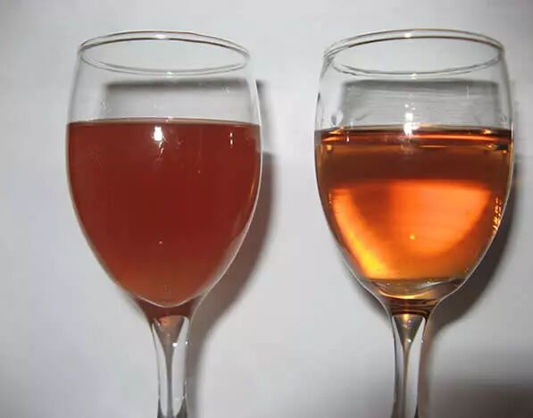 36. 葡萄酒对比,经过下胶过滤的葡萄酒颜色更为透亮澄净。