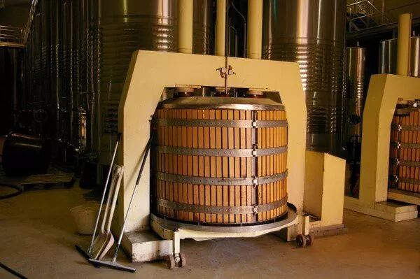 26. 葡萄酒发酵完成后,剩下的皮、籽和梗会进入压缩机中进行压榨,以进一步萃取其中的精华物质。下面是一个筐式压缩机,是一种比较传统的压榨设备。