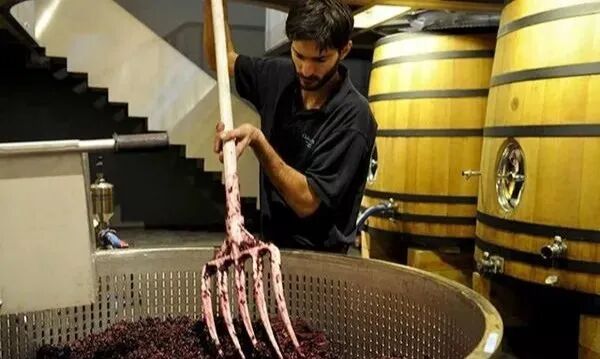23. 压酒帽:葡萄皮和果肉会在发酵过程中被产生的二氧化碳顶到表面,这个大大的浮积物我们叫“酒帽”,所谓压帽,就是把这些果皮和果肉压下去,让它和发酵中的汁液进一步接触。可以用机器或人工完成。