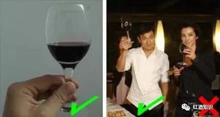 错:用拿啤酒的方式握住高脚杯的杯壁,就像最右图中的冰冰姐一样。当然,最好不要这样做,因为葡萄酒对温度有严格的要求,用手握住杯壁势必会将手指的温度传递到酒杯中影响酒温,不利于酒的正常发挥。