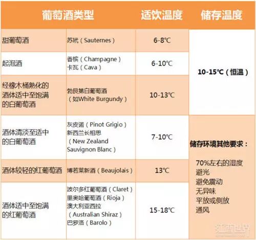 白葡萄酒的适饮温度要比红葡萄低,但不低于7℃。酒体轻盈或者中等酒体的白葡萄酒需在7至10℃的温度下饮用。而经过橡木桶熟化的中等或饱满酒体的白葡萄酒最好轻微冰镇后饮用,最佳温度为10至13℃。另外,香槟(Champagne)、卡瓦(Cava)等起泡酒需充分冰镇,使温度介于6至10℃时饮用。至于甜葡萄酒,最佳温度则为6至8℃。