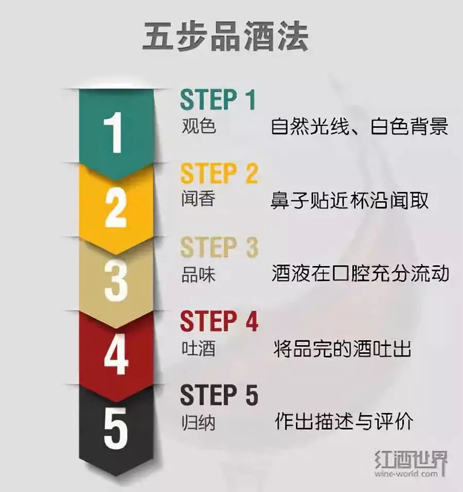 品酒一般遵循5个步骤,即观色、闻香、品尝、吐酒和归纳。观色是指在自然光和白色背景下观察杯中葡萄酒的颜色。闻香是在酒倒入杯中时马上闻取葡萄酒自然散发的香气,再对杯中酒进行适当程度的摇晃,闻取释放出的香气。接着就是品尝了,小呷一口。在咽下酒之前,让你的口腔充分接触到酒液,体会葡萄酒的酸、甜、单宁、酒体、余味和酒精度。在换下一款酒前,你最好先把上一款酒吐出清口,这样能让你保持头脑清醒,以迎接下一款佳酿。最后,你需要对这一款葡萄酒作出一个综合性的归纳。写品鉴记录或直接评说葡萄酒都是不错的方式。