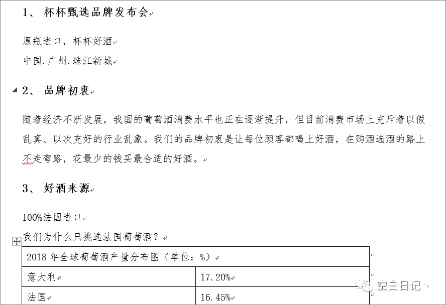 先来看看甲方给的Word(节选),可以看出甲方爸爸很优秀已经文案已经分好了点,初略一看大概每一点就是每一页的内容。于是我们第一步的任务就是团队每一个人,封面以及自选两页出五份样稿。