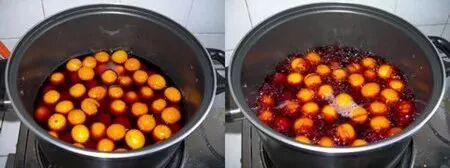 4.扎好眼的金桔再倒入锅中,加入红酒没过金桔,大火把红酒烧开后换小火煮5分钟即可。