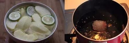 2.青柠和苹果切片,一同泡在凉水中。炖锅中加入红酒,依个人口味加入适量冰糖。