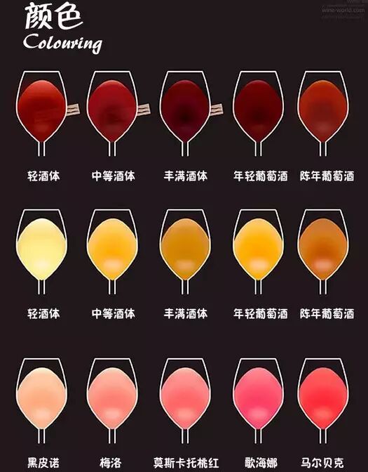 不同的品种,有自己独特的特征。像赤霞珠、西拉、美乐等葡萄品种的颜色通常特别深黑偏蓝紫,黑皮诺和歌海娜的颜色就会比较浅,且偏橘红。