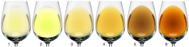 白葡萄酒颜色主要有:柠檬绿(Lemon-green),柠檬(Lemon),金黄色(Gold),琥珀色(Amber),棕色(Brown)。白葡萄酒随着酒龄增长,颜色由浅入深。颜色越浅,酒款就越年轻。