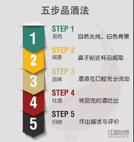 品酒一般遵循5个步骤,即观色、闻香、品尝、吐酒和归纳。观色是指在自然光和白色背景下观察杯中葡萄酒的颜色。闻香是在酒倒入杯中时马上闻取葡萄酒自然散发的香气,再对杯中酒进行适当程度的摇晃,闻取释放出的香气。接着就是品尝了,小呷一口。在咽下酒之前,让你的口腔充分接触到酒液,体会葡萄酒的酸、甜、单宁、酒体、余味和酒精度。在换下一款酒前,你最好先把上一款酒吐出清口,这样能让你保持头脑清醒,以迎接下一款佳酿。最后,你需要对这一款葡萄酒作出一个综合性的归纳。写品鉴记录或直接评说葡萄酒都是不错的方式。