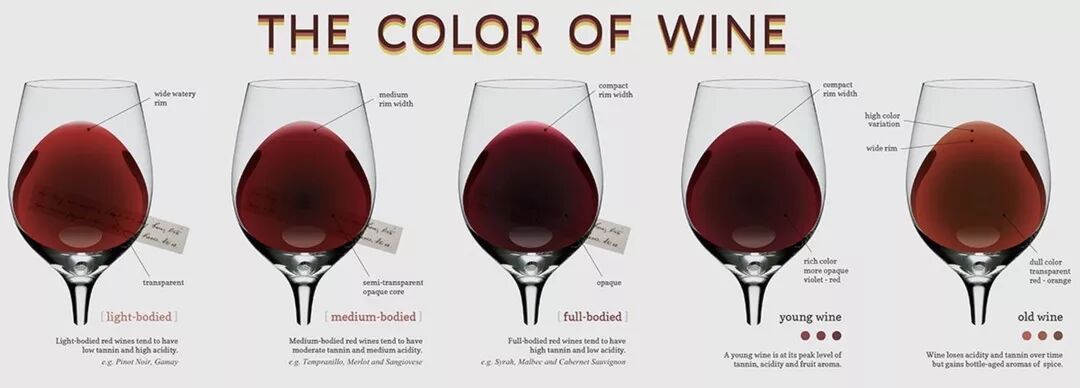 在开始喝之前,先观察颜色可以让我们初步了解几个葡萄酒透漏的信息:
