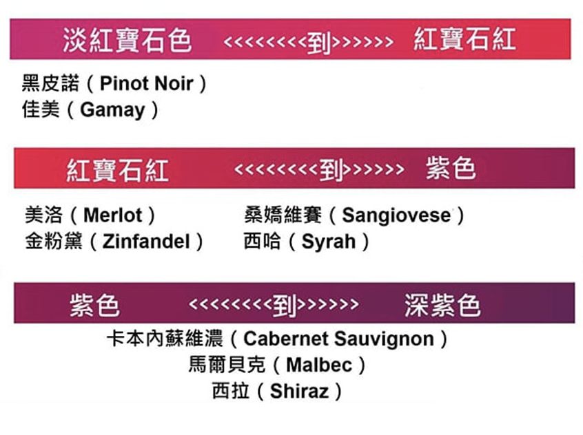 而随着葡萄品种的不同,花青素也会有不同的化学排列,进而建构出深浅不同的红色。