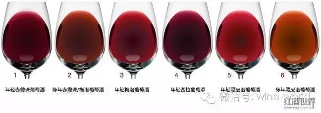随着陈酿时间的变长,红葡萄酒的颜色会变得越来越浅。根据颜色的变化情况,结合一些葡萄酒基础知识,我们就能大致了解到葡萄酒酒龄、葡萄品种及产地等信息。