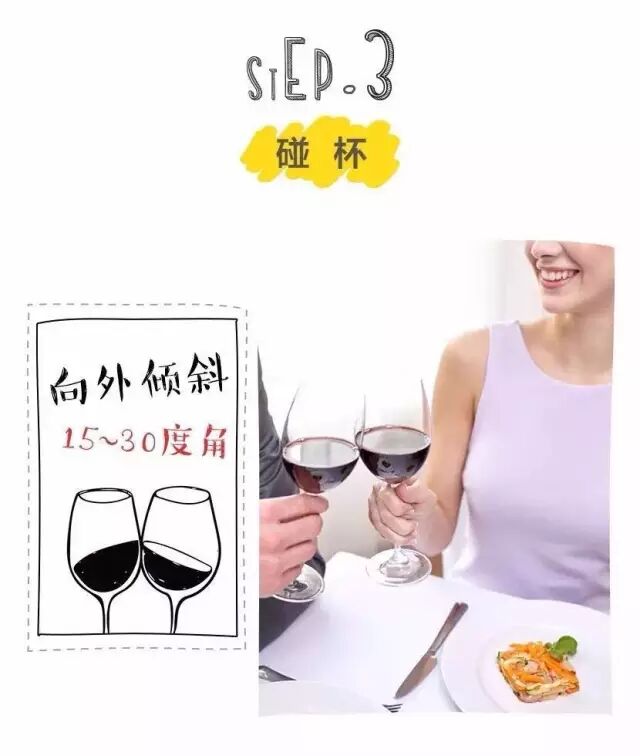 酒杯逆时针向外倾斜15-30度角,两只酒杯并排放置,杯口不要碰到对方杯,碰杯时发出清脆“叮”声即可。