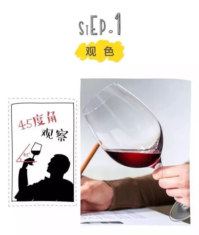 可把杯子放在白色背景的前方,微微向外倾斜酒杯45度观察。酒色会随时间变淡,年轻时是紫红色,然后慢慢转为暗红色。