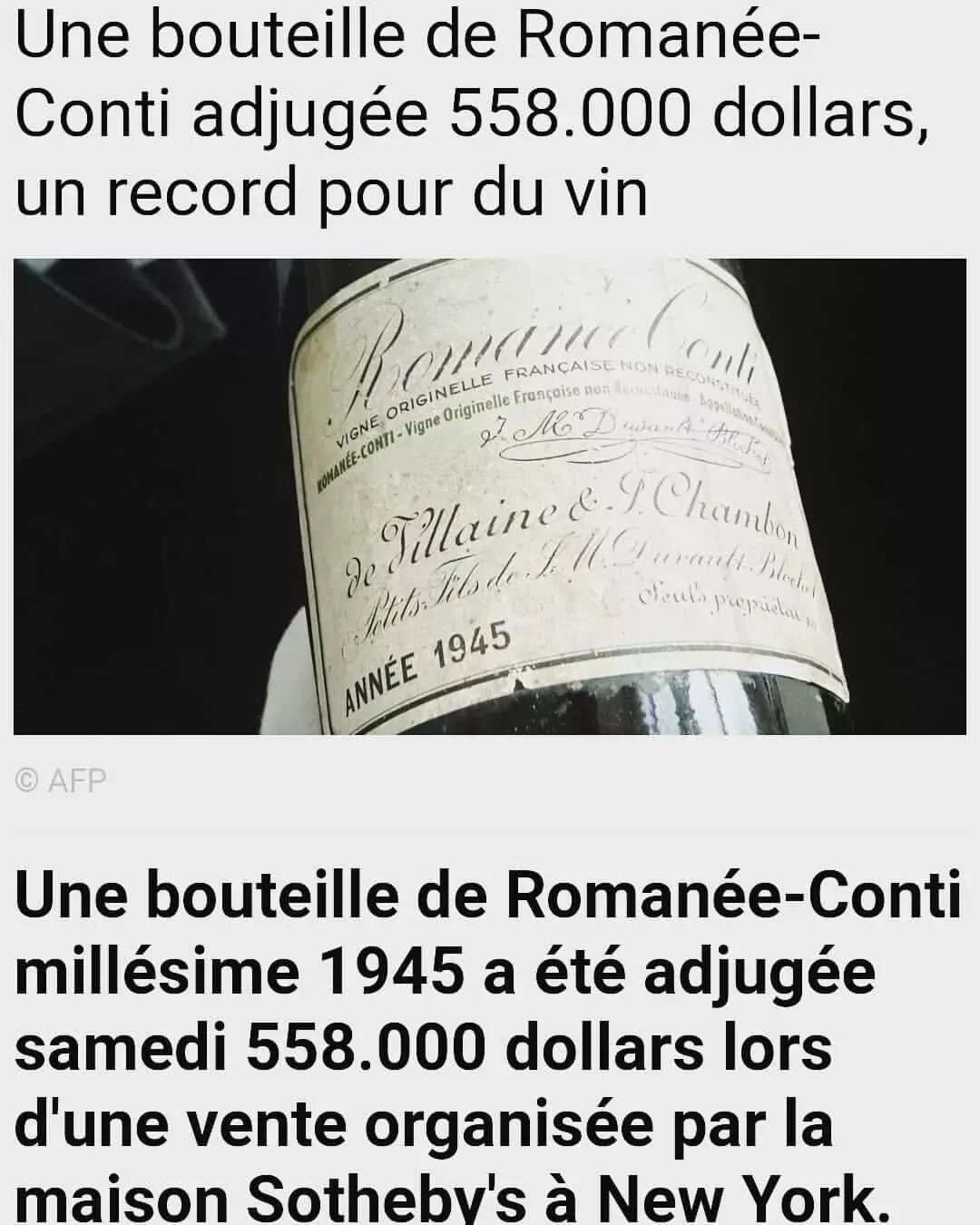 在2018年10月13日的苏富比纽约拍卖会上,一瓶1945年份的罗曼尼·康帝最终以558000美金的价格成交(约合386万人民币)。这一价格打破了1992年份的啸鹰赤霞珠干红葡萄酒500000美金的世界纪录,使来自勃艮第的罗曼尼·康帝登上了全世界最贵葡萄酒的王座。