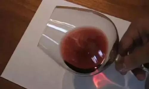 将酒缓缓倒入杯内约1/4杯左右。可把杯子放在白色背景的前方,微微向外倾斜酒杯,大概45度为宜,以清楚的观察酒的颜色。红酒的颜色会随着时间而逐渐变淡,年轻时是紫红色,然后慢慢转为暗红色。