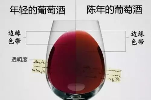 红酒的标签是个大学问,从里面可以看出红酒的年份、产地等。其次,就是看红酒的色泽度,一般观色主要看颜色的透明度、清澈度和酒体的浓度。