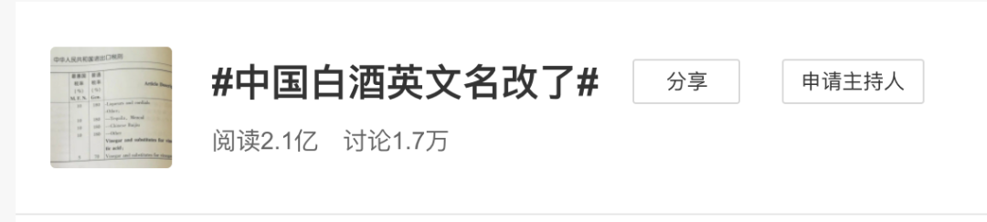 1月14日上午,中国白酒改英文名的事情引来网友热议,#中国白酒英文名改了#的话题一度冲上热搜,每经小编注意到,目前该话题的阅读量为2.1亿,讨论量为1.7万。