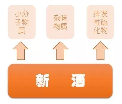 从化学分析的角度来说,新酒里有较多的低沸点小分子物质,如甲醇、乙醛、糠醛等,还有少量的丙烯醛、丁烯醛、游离氨等杂味物质,以及硫化氢、硫醇、硫醚(二甲基硫)等挥发性硫化物。