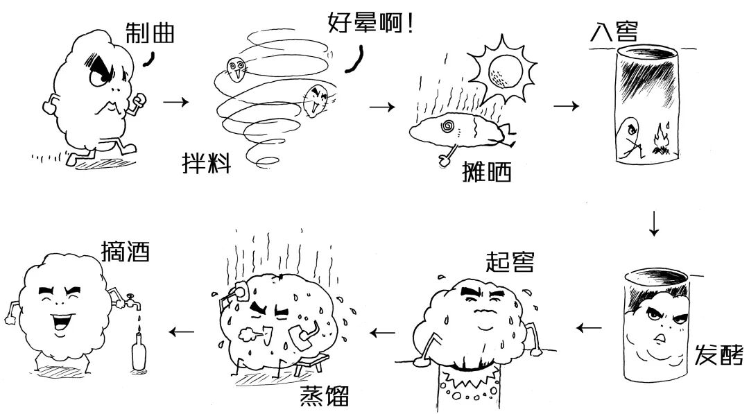 工艺大体有制曲、拌料、摊晒、入窖、