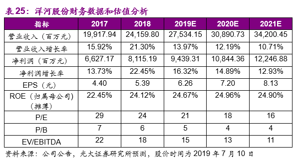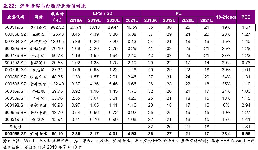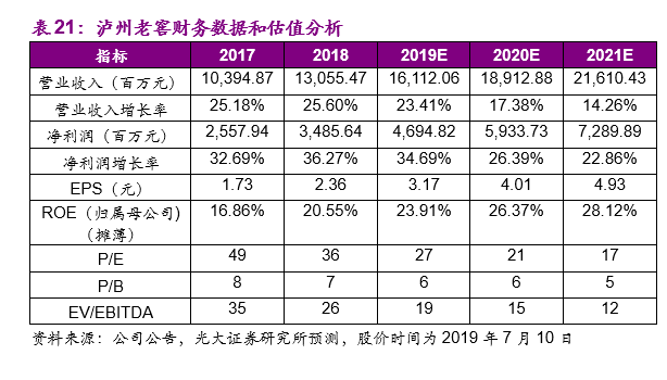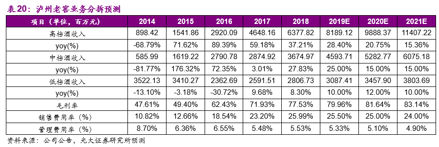 (1)高档酒业务,我们预测公司2019/2020/2021年收入增速分别为28.40%/20.75%/15.36%,其中2019年上半年在茅台供应短缺的情况下,国窖1573也顺势实现销量提升,手握高端白酒入场券,老窖长期受益于高端白酒的需求扩容,我们预计2019-21年销量的增长分别为20%/15%/12%,同时五粮液的价格上挺为老窖的渠道费用收缩和价格上挺提供了客观基础,我们预计2019-21年销售吨价的增长分别为7.0%/5.0%/3.0%;中档酒业务,我们预测公司2019/2020/2021年收入增速分别为25.00%/15.00%/15.00%;低档酒业务,我们预测公司2019/2020/2021年收入增速分别为10%/12%/10%。