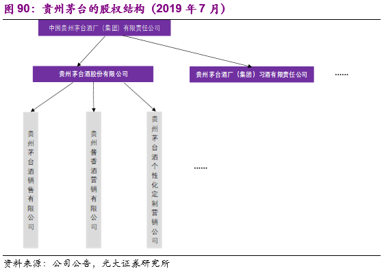 股权结构:贵州茅台的控股股东为中国贵州茅台酒厂(集团)有限责任公司,实际控制人为贵州省国资委,控股股东中国贵州茅台酒厂(集团)有限责任公司除了控股上市公司之外,还有贵州茅台酒厂(集团)习酒有限责任公司、贵州茅台酒厂(集团)保健酒业有限公司等其他白酒相关资产。上市公司贵州茅台股份有限公司有两个重要的子公司:贵州茅台酒销售有限公司和贵州酱香酒营销有限公司,分别负责茅台酒和系列酒的销售。