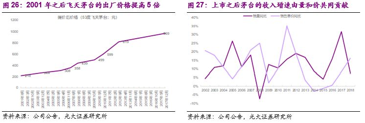 特殊的消费场景及消费属性不仅带来白酒相对刚性的消费需求,更带来其无可比拟的定价权优势:形成消费粘性之后品牌消费品公司往往具备定价权优势,这也使得品牌消费品既能够将上游原材料成本的压力顺利转移给下游消费者、保证稳定的盈利能力,又有助于其产品价格在长周期内跑赢通胀指数,为收入的增长贡献价格的弹性。对于白酒而言,这种定价权优势会更加显著:无论是社交消费还是礼品消费,消费者会更倾向为高定价的高端白酒产品买单,而满足在消费过程中的潜在的除温饱之外的更高层次需求。我们以定价权最强的贵州茅台为例,2001年开始,飞天茅台的出厂价从178元一路上涨到2017年的969元,年均复合增速达到11.2%,成为上市之后收入增长的除量增之外的重要贡献因素。