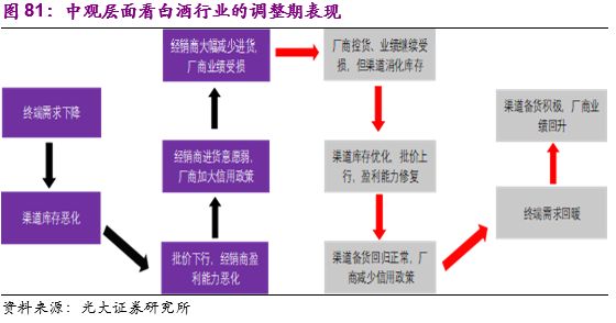 综上所述,白酒特殊的消费场景及产品保值特性分别从宏观层面及行业层面刺激了白酒需求的周期性波动。宏观经济趋势向好时,无论是企业部门的盈利还是居民的可支配收入都有改善,白酒的社交消费及礼品消费需求均有推动。而白酒特殊的保值能力使得在白酒顺景气周期中,经销商和终端消费均有加库存的意愿和能力,白酒的投资需求会被进一步激发,这样行业层面的类牛鞭效应又放大了白酒的周期性波动。与之相反,在经济下行周期,企业和居民部门的盈利能力下降带来白酒社交需求和礼品需求的活跃度下降,产品价格出现下降、渠道库存开始提高之后,行业层面也会进一步去库存,白酒的需求波动同样非常明显。