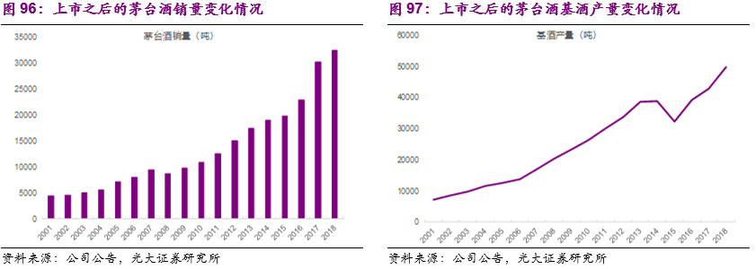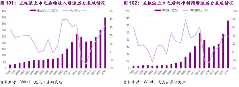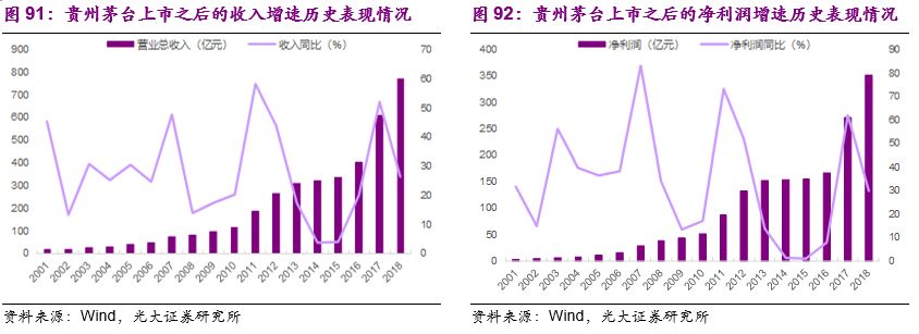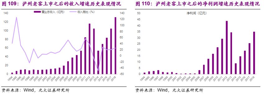 我们以龙头公司茅台和五粮液为例,2002年上市之后到2018年的最新财报,茅台的营业总收入从18.35亿提高到近772亿元、净利润从3.77亿元提高到352.04亿元,收入和净利润的年均复合增速分别为26%和33%。五粮液1999年上市,1999-2018年期间,其收入规模从33.08亿提高到400.3亿元、净利润从6.49亿元提高到133.84亿元,收入和净利润的年均复合增速也分别达到了14%和17%。