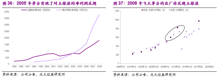 但是买断经营模式下的五粮液虽然收入规模不断壮大,但盈利能力却出现下降,2005年五粮液和茅台的收入规模分别为64.2亿和39.3亿元,然而净利润分别为7.9亿和11.2亿,茅台实现了在净利润上的反超。2008年飞天茅台的出厂价上调至439元,实现了对五粮液的反超。与此同时五粮液的主品牌价值也在不断稀释,并且在第三次白酒调整期失去行业第一把交椅。