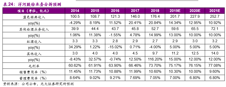 (2)其他白酒业务,我们预测公司2019/2020/2021年收入增速分别为13%/10%/10%。