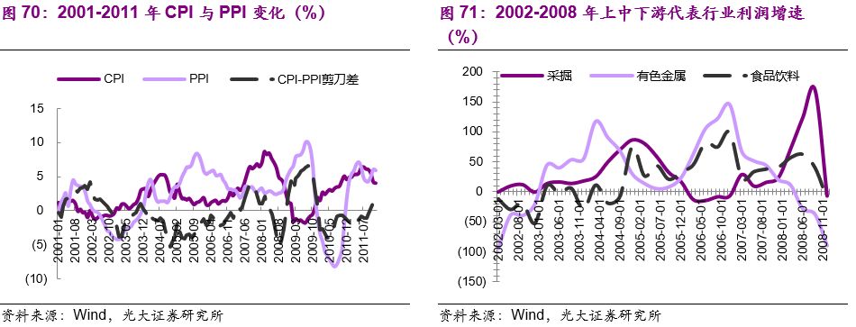 2004-2007年的宏观背景基本特征:货币/信贷显著放松提振需求、通胀温和上行带动CPI-PPI剪刀差扩大。在经历了2004年严厉的宏观调控之后,国内货币供应量开始逐步恢复,M2的回升从2005年初一直持续至2006年上半年。同时CPI于2005年三季度开始企稳,并在2006开始迈入长达两年的趋势性上升期;另外一方面,受制于产能过剩,PPI指数趋势性回落直至2007年上半年才得以结束。CPI-PPI剪刀差的触底回升,下游受成本约束的行业迎来转机,以农副加工食品为主的下游消费品行业毛利率出现显著抬升。