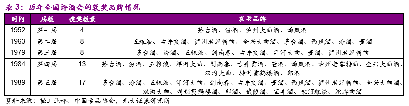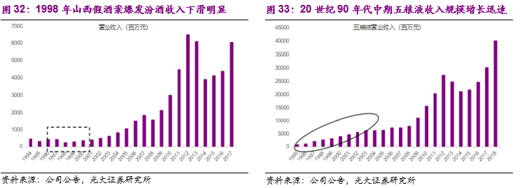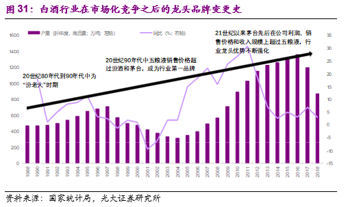 1)20世纪80年代-90年代初:汾酒时代。1949年6月国营山西杏花村汾酒厂成立,并且在1952年的第一届全国评酒会中和茅台、泸州大曲、西凤酒共同获奖成为全国四大名酒。此后1963年和1979年第二届和第三届全国评酒会中汾酒再次获奖,成为清香型白酒的代表。正值改革开放之际,政府决定扩建发展全国十大名酒厂,汾酒抓住机遇于1985年成为全国最大的名白酒生产基地,当年产量突破8000吨,占当时全国13种名白酒产量的一半,并且从1988年开始连续多年位居白酒行业第一。