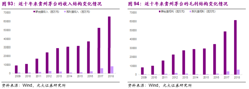 无论是在收入结构还是利润贡献上,茅台酒系列都是贵州茅台最主要的业务构成。以2018年年报为例,茅台酒实现销售收入654.87亿元,占主营酒类业务收入的比重为89%;茅台酒实现销售毛利613.89亿元,占主营酒类业务毛利的比重为91.5%。2018年茅台酒的毛利率达到93.74%,也远高于系列酒71.05%的毛利率。