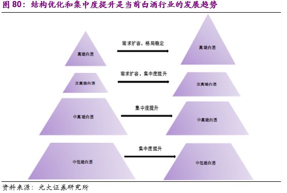 综上所述,渠道库存的波动通常会放大白酒的需求波动,加速白酒行业景气周期的波动,所以白酒景气周期的变化通常可以通过产品批价、厂商预收款及应收款变动等行业中观指标去验证。但是,在考虑白酒景气周期波动之前,需要明确的是当前国内白酒的竞争格局及消费结构,无论白酒景气周期如何波动,消费升级背景下白酒行业的消费结构优化、各价格带名酒的集中度提升是中长期内不变的基调。