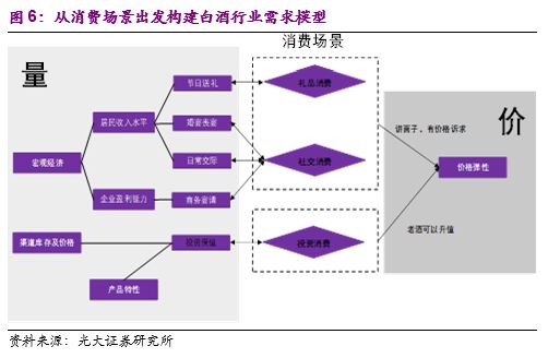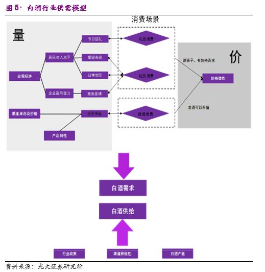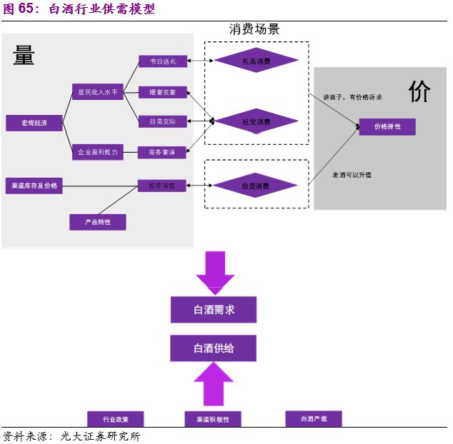 1)基于白酒行业特殊的消费场景,我们延伸出了对白酒消费“量”和“价”两个维度的驱动因素的分拆,搭建起白酒行业的需求模型。在供给端,宏观政策、中观渠道推力及微观企业产能限制是决定白酒供给端的几大核心因素。