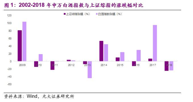2016年开始,食品饮料板块开启了一轮以白酒行业为主导的牛市行情。其实不仅仅是过去三年,拉长历史周期来看白酒行业的二级市场表现也体现出“牛长熊短”的特点,以2002年(茅台上市之后第一个完整年度)为回顾的起点,2002-2018年这17年间,白酒(申万行业指数)行业指数共有12个年份取得了相较于上证综指的相对收益。为什么白酒行业能够持续取得相对收益,和其他消费行业比、白酒行业具备哪些优势和特点,白酒行业的研究和投资框架如何搭建,这些问题正是本文的研究背景。