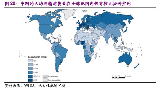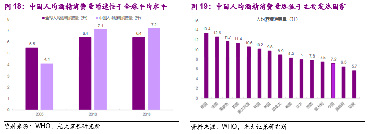 我们以世界卫生组织(WHO)2018年最新版《全球酒精与健康状况报告》的数据作为参考,报告显示 2016年中国的人均酒精消费量为7.2升,相较于2005年4.1升、2010年7.1升的人均消费量仍保持增长状态。与此同时,2016年全球的人均酒精消费量为6.4升,增长速度相对缓慢。在世界范围内,中国的人均酒精消费量远低于主要的发达国家,人均酒精消费量较高的德国和法国分别达到13.4升和12.6升,中国的人均酒精消费量仍有较明显的提升空间。