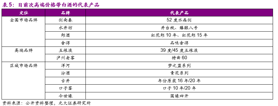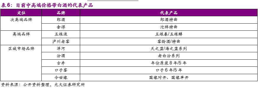 白酒行业价格带鲜明,不同价格带的竞争格局也不尽相同:正是由于白酒品牌价值的打造是日积月累的过程,同时消费者愿意给白酒付出产品溢价归根到底是为白酒的特定品牌力在社交及送礼消费中所发挥的特殊作用买单,白酒行业形成了比其他消费品行业更鲜明的产品价格带体系。以主力产品的终端销售价格为划分标准,单瓶在800元以上为高端白酒、300-800元之间为次高端白酒、100-300元之间为中高端白酒、100元以下为中低端白酒。目前高档白酒主要为茅台、五粮液以及国窖1573三大品牌;次高端价格带以剑南春、洋河梦之蓝、水井坊、郎酒、汾酒青花、舍得等为代表;中高端价格带以地产酒主力产品洋河海之蓝、天之蓝、古井年份原浆5年、口子窖6年以及高端白酒系列酒茅台王子酒、五粮春、老窖特曲等;中低端白酒以金种子、汾酒玻汾、牛栏山等品牌为主。