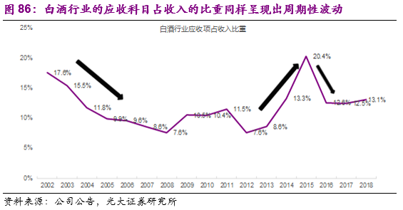 由于渠道库存的波动而带来的白酒需求波动可以通过中微观指标去验证:首先,在白酒景气度下行周期,终端动销放缓之后经销商库存压力变大、产品周转速度变慢,经销商开始出现资金紧张。由于白酒厂商在下游供应链体系中处于强势的地位,正常情况下基本采取先款后货的方式,在经销商资金链紧张的情况下,从厂商层面可以观测到的是给经销商的信用政策在放宽,厂商报表中的应收项(应收票据+应收款项)占收入的比重在提升。我们详细统计了2002-2017年白酒行业所有上市公司的应收项占收入的比重,该比重从2003年的15.5%迅速下降到2005年的10%左右;而2012-2015年深度调整期,该指标从7.6%提高到20.4%,之后又在2016-2018年下降到12%左右。