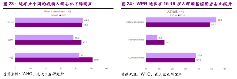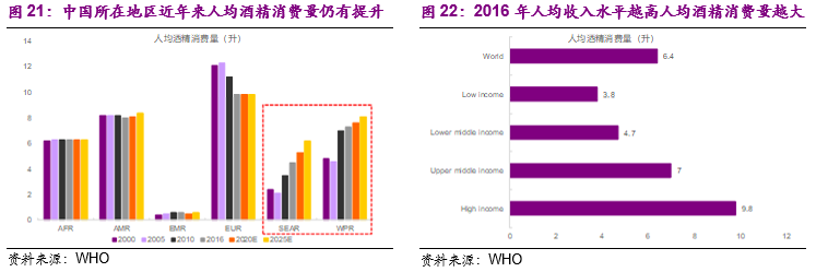 人均酒精消费量和经济发展水平有非常明显的相关关系。世界卫生组织的报告同样显示,全球范围内人均酒精消费量和经济发展水平有非常明显的相关关系。一般情况下,经济发展水平越高、速度越快,人均酒精消费量越高、戒酒人群的占比也会越低。两个数据可以说明:1)2016年全球人均酒精消费量为6.4升,高收入水平国家和中高收入水平国家的人均酒精消费量分别为9.8升和7升,远高于低收入国家(3.8升)和中低收入国家(4.7升)。2)从近些年来不同区域的人均酒精消费量增长速度来看,中国所在的西太平洋地区(Western Pacific Region、简称WPR)和印度所在的东南亚地区是增长最快的两大地区(South-East Asiaregions、简称SEAR),其中西太平洋地区的人均酒精消费量从2000年的4.8升提高到2016年的7.3升,世界卫生组织预计到2025年将达到8.1升;东南亚地区的人均酒精消费量从2000年的2.4升提高到2016年的4.5升,世界卫生组织预计到2025年将达到6.2升。
