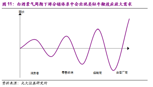 原因二:白酒特别是高端白酒的保值特性刺激渠道和居民的囤积库存需求,完成行业层面的加杠杆过程。类似于经济学中的“牛鞭效应”,即供应链环节上的一种需求变异放大现象。由于白酒的生产工艺特点,白酒不仅没有保质期的限制,以酱香型白酒为代表、其储藏时间越长往往越具有升值的空间。在白酒景气周期,白酒价格处于上升通道,一方面厂商可以向经销商渠道进行压货,另一方面无论是经销商为代表的渠道端还是居民,都会有一定的囤积白酒需求,造成厂商出货口径的白酒需求被加杠杆放大。同样在白酒景气下行周期,杠杆也会被刺破,加大了白酒需求量的周期波动性。