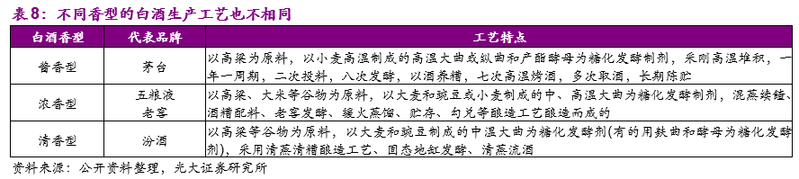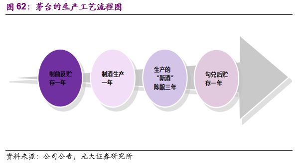 以酱香型白酒的代表贵州茅台的生产工艺为例,茅台酱香型白酒的生产工艺特点为“三高三长”,“三高”是指茅台酱香型白酒生产工艺是高温制曲、高温堆积发酵、高温蒸馏酒;“三长”是指茅台酱香型白酒基酒生产周期长,大曲贮存时间长,茅台酱香型白酒基酒酒龄长。茅台酒的生产从投料到出商品酒约须经6年时间,制曲及贮存一年、制酒生产一年、生产的“新酒”陈酿三年、勾兑后贮存一年,这样茅台酒的实际供应就会严格受限于生产周期以及生产流程中的基酒产量限制。