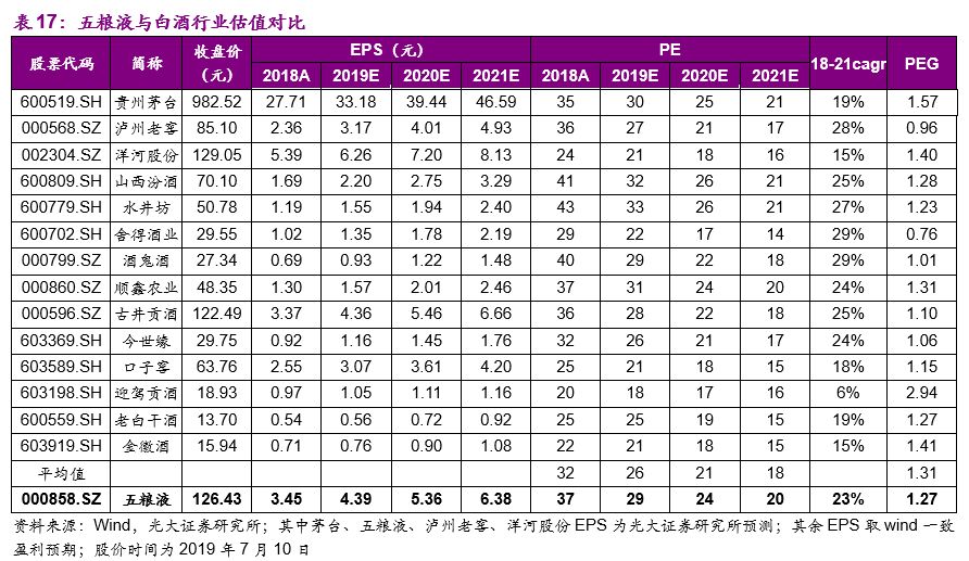 盈利预测与投资建议:我们预测五粮液2019/2020/2021年实现营业收入500.05/582.78/668.20亿元,分别同比增长24.92%/16.55%/14.66%;归母净利润170.29/208.25/247.52亿元,同比增长27.23%/22.29%/18.86%;对应EPS分别为4.39/5.36/6.38元,当前股价对应2019/2020/2021年PE分别为29x/24x/20x,略高于行业平均估值水平。2019年以来五粮液在产品和渠道上积极变革,并充分受益于茅台一批价格的提升,在放量的基础上同时实现了产品批价和零售价格的上挺,首次覆盖给予“买入”评级。