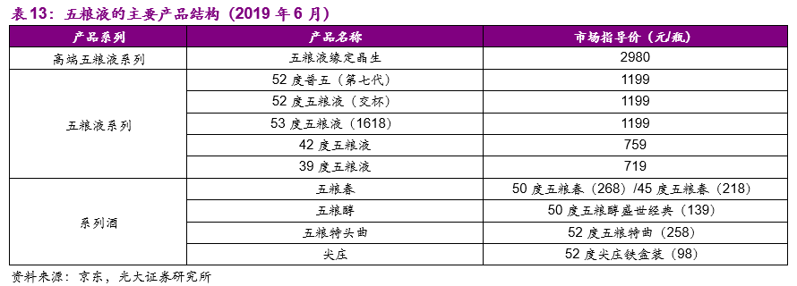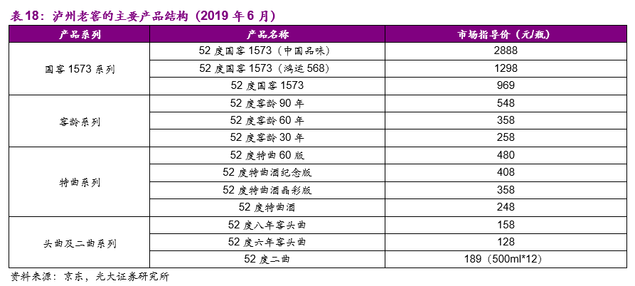产品结构:泸州老窖的产品价格带更为齐全,大致可以分为:1)高档白酒国窖1573系列,国窖1573和飞天茅台、五粮液是目前国内白酒行业三大高端品牌;2)中档白酒窖龄和特曲系列,其中窖龄系列定位200-500价格带,主要包括窖龄90年/60年/30年。特曲系列包括定位在400-500元的特曲60版、300-400元的特曲晶彩版与纪念版、200-300元的老字号特曲;3)低档白酒头曲和二曲系列,分别定位于100-200元以及100元以下的价格带。